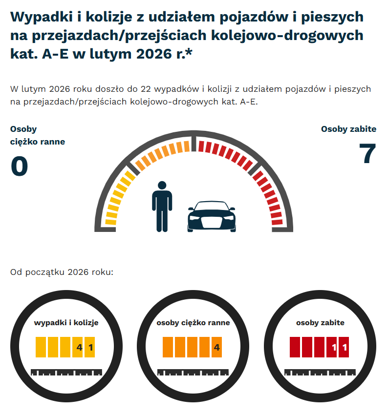 Ponadto w drugim miesiącu 2026 roku miały miejsce 22 wypadki z udziałem pieszych w miejscach niedozwolonych. W ich wyniku zginęło 16 osób, a 2 zostały ciężko ranne.