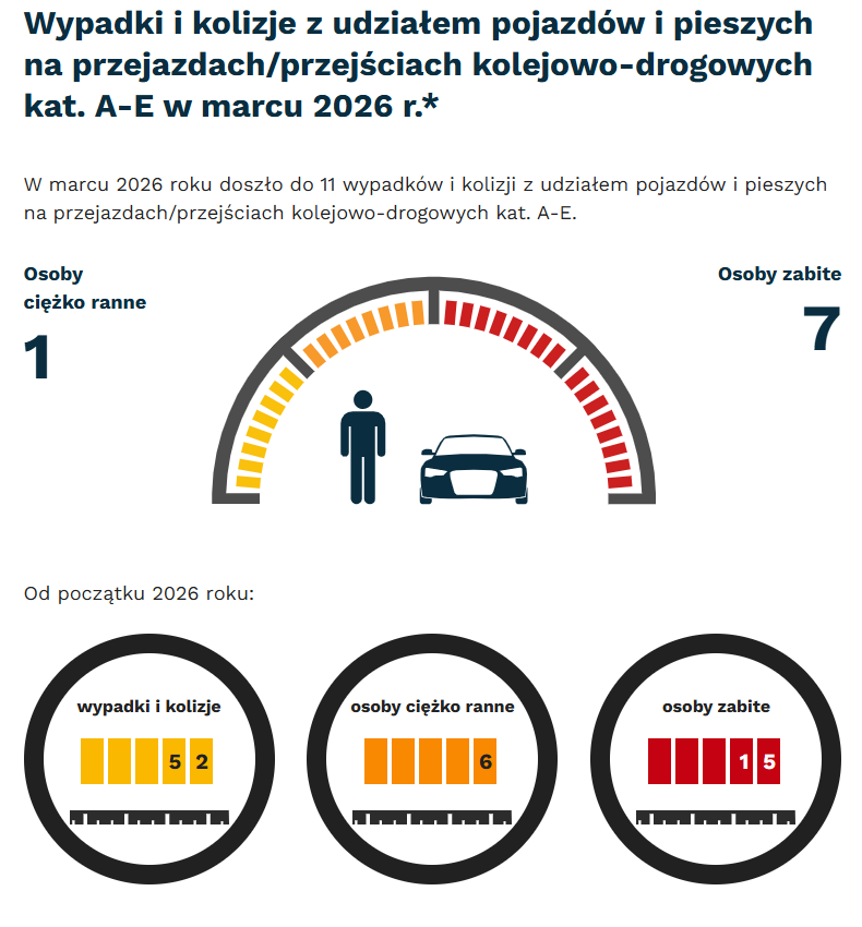 W 2026 roku na przejazdach wydarzyło się 52 wypadki i kolizje (o 10 więcej niż