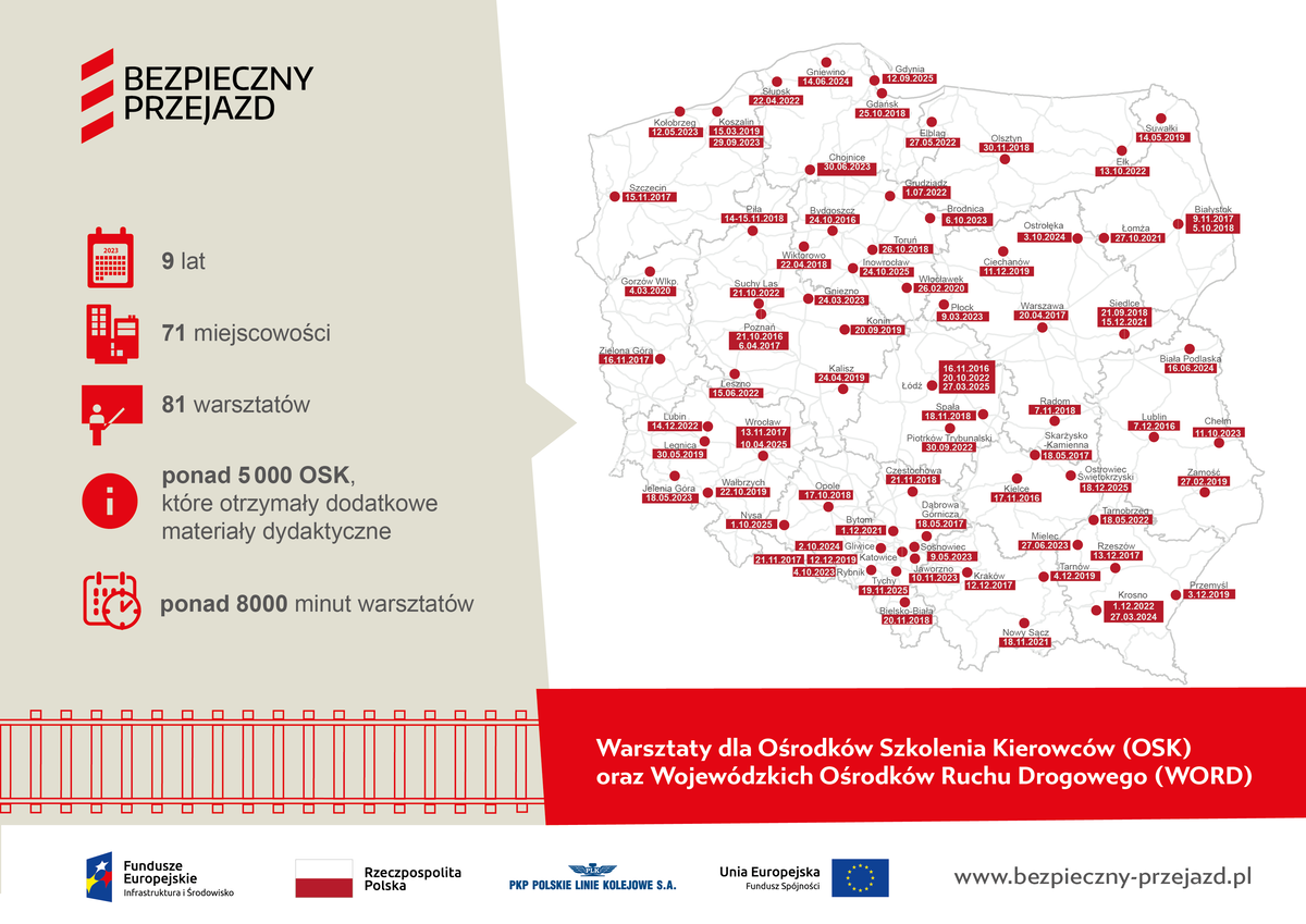To instruktorzy nauki jazdy mają największy wpływ na to, jakich nawyków na drodze nabiorą młodzi kierowcy. Dlatego właśnie eksperci do spraw bezpieczeństwa z PLK od 2016 roku jeżdżą po całym kraju i przeprowadzają specjalistyczne seminaria dla przedstawicieli szkół nauki jazdy. Staramy się być wszędzie tam, gdzie są uczeni młodzi kierowcy. Zjeździliśmy Polskę od Rzeszowa po Szczecin i od Suwałk po Jelenią Górę. Łącznie ok. 5000 OSK otrzymało materiały dydaktyczne. Podczas warsztatów odtwarzane są filmy prezentujące zdarzenia na przejazdach, ciekawostki, omawiane są przykłady niewłaściwych oraz pożądanych zachowań kierowców. Instruktorzy dostają „pigułkę” wiedzy, którą mogą wykorzystać podczas swoich zajęć z kursantami. Ważnym aspektem jest również możliwość wymiany doświadczeń z uczestnikami warsztatów.